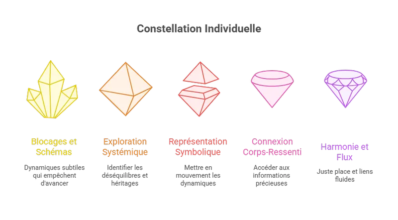 La constellation individuelle agit comme un miroir : elle permet de voir ce qui, dans le système, cherche à se rééquilibrer. En rendant visibles les liens invisibles, elle ouvre la voie à une compréhension nouvelle et à une libération souvent profonde.